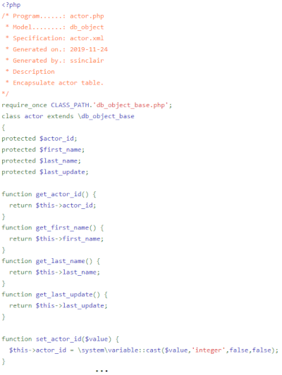In order to prevent this situation from happening, the db_object classes keep track of the value of the logical record locking field at all times. Let's say this was defined as a timestamp field. In our scenario, in step 1 the db_object class would make note of the current timestamp for customer 93122 when it is read by user 1. In step 2, user 2 would cause this timestamp field to be updated to the current time. In step 3, before going ahead with the updates requested by user 1 it would make sure the timestamp value had not changed since the original record was supplied to user 1. If the timestamp had changed, user 1's updates would be rejected. User 1 would need to re-read the object data in order to make changes. Defining The Object TablesMost db_object classes will be used to maintain a single SQL table known as the primary table. Additionally, a db_object class can maintain any number of secondary tables. In most cases these secondary tables are related to the primary table with cardinality 1:many. The related tables are generally dependent on the primary table. For example, it is not possible for an Order Line to exist without an Order (header). One of the hallmarks that suggest that a table is dependent on another table is that the dependent table implements a cascading delete constraint. For example, if an Order is deleted, all order lines should also be deleted. This tight relationship suggests that the order table and the order_lines table should be part of the same db_object. Note that there does not have to be a cascading delete constraint defined within the database since the db_object takes care of handling this automatically. Exposing the ObjectOne of the benefits of using db_objects is that they hide the complexity of the data model and also the technical details of the underlying database from the clients that use the generated db_objects. The users of the object simply view the data as a series of properties. Secondary tables are represented as arrays of properties. To change the object, the object users simply call methods to change the properties or insert and delete rows from the arrays representing dependent tables. Shared Validation RulesHTML 5 offers many useful validation features such as limiting values to dates or numbers, setting ranges, restricting lengths, etc.. While these are certainly useful in trapping errors within forms, these validations cannot be relied upon for protecting the integrity of the data. In some cases, the db_object may be used by "headless" components that cannot take advantage of form validation. Even if all of the access to an object is supposed to be via a form, hacker can easily post requests that bypass the forms in order to pass data to the server that could compromise the data integrity. In order to take advantage of the rich validation features offered by modern browsers while at the same time protecting the integrity of the data when the browser validation is bypassed, db_objects allow you to specify certain validation rules that will be replicated on both the client (in the browser) and on the server (within the db_object). This approach gives you, the developer, the best of both words. You can implement rich client validation without having to manually keep the server validation is sync with the client validation since both sets are validation are derived from the same set of rules. Database ConstraintsOne of the key advantages of using an SQL database to store your data is that the database can enforce certain constraints automatically. For example, utilizing database rules you could make it impossible to store an order record that points to a non-existent customer record. While this is certainly a great feature, one of the challenges of utilizing these constraint rules is that it is very difficult to convey constraint violations to your end users (web form users) because it is often not possible to determine what database constraints caused an error to be raised within the database in order to instruct the user on correcting the problem. For this reason, it is generally necessary to implement the same constraints within your program logic in order to give your users proper information on what they need to correct to save or update an object instance. Even though these rules are implemented within your program logic (inside a db_object) it is still a good idea to have these constraints enforced by the database in case the program rule is bypassed for some reason. Defining Your ObjectsConsider the following partial data model of the sakila database that ships with MySql 8. This database is used to manage a video rental enterprise.